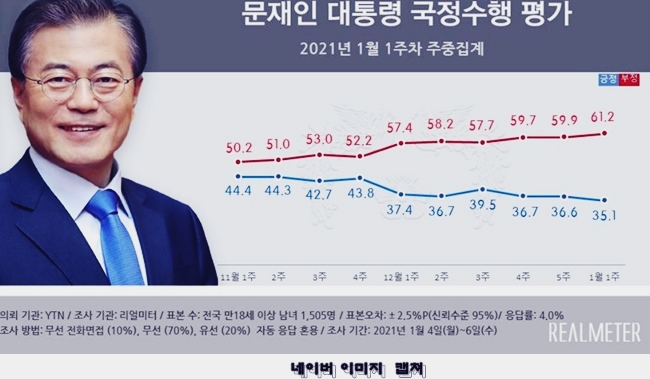 문재인 대통령이 최근 지지율 여론 평가에서 긍정평가가 35.1% 부정평가가 61.2%라는